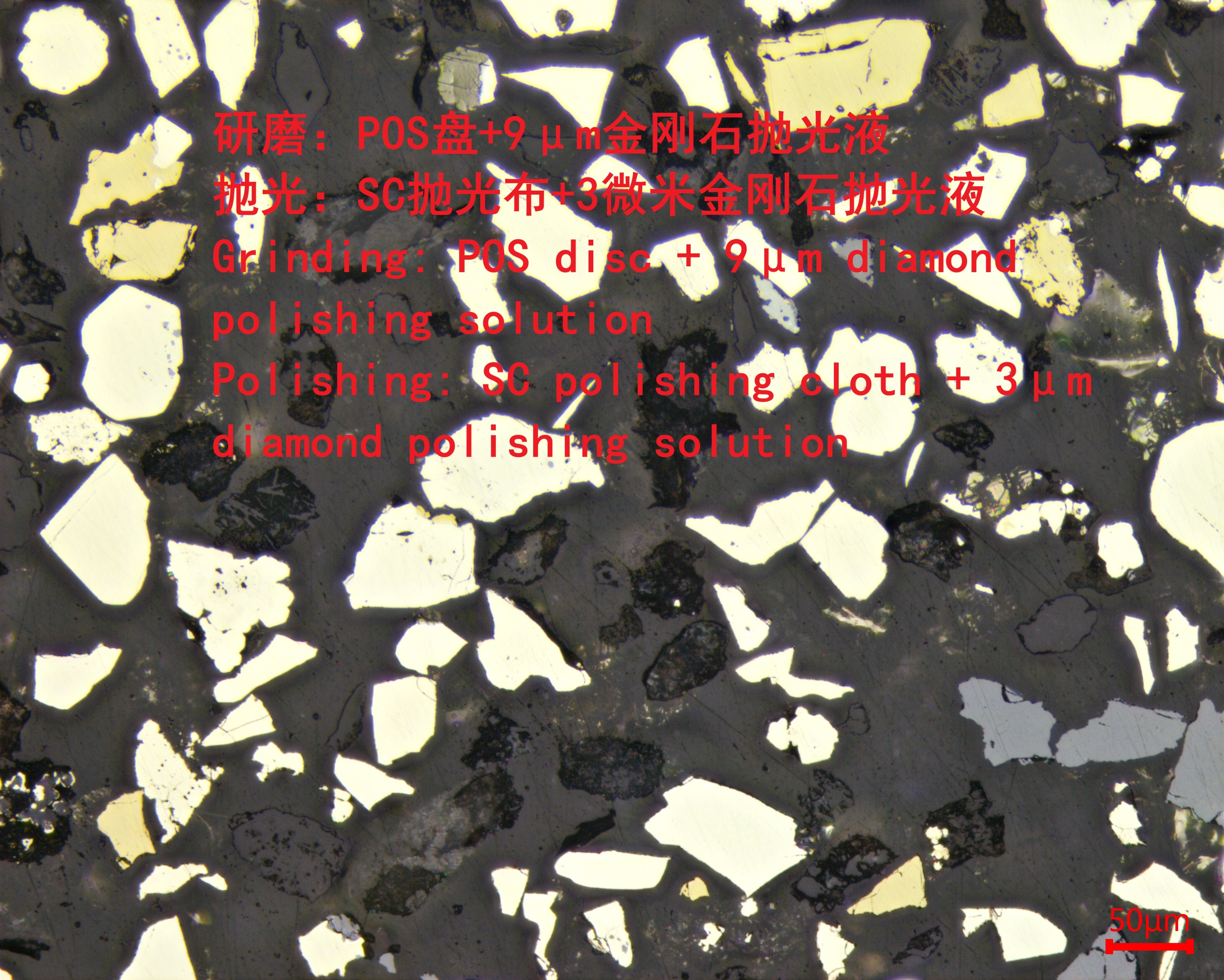 Observatie wordt uitgevoerd met behulp van de MN80 metallografische microscoop. De metallografische foto's na het polijsten laten zien dat de witte blokken oxidedeeltjes zijn, de gele blokken zijn ijzerdisulfidekristallen, de grijze of zwarte zijn klei-mineralen en gaten van onregelmatige grootte worden afgewisseld in het midden.